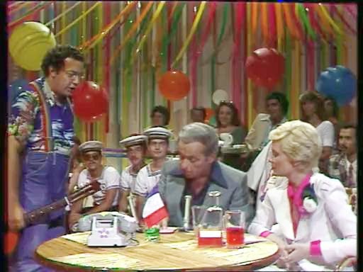 - Guy BEART chante "La gambille", accompagné par ses musiciens et l'orchestre. Il joue à la guitare. Chorégraphie sur la piste de danse située derrière le chanteur. Puis il chante "vive la rose" et "Il fait beau" avec musiciens et orchestre l'accompagnent.